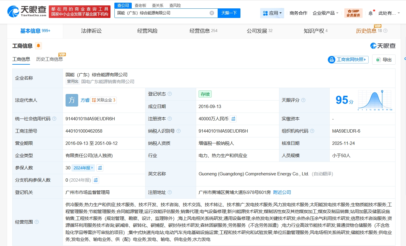 该公司成立于2016年9月,法定代表人为方睿,经营范围含供冷服务、热力生产和供应、发电技术服务、风力发电技术服务、太阳能发电技术服务、生物质能技术服务、工程管理服务、节能管理服务等。股东信息显示,该公司由国家能源集团广东电力有限公司全资持股。