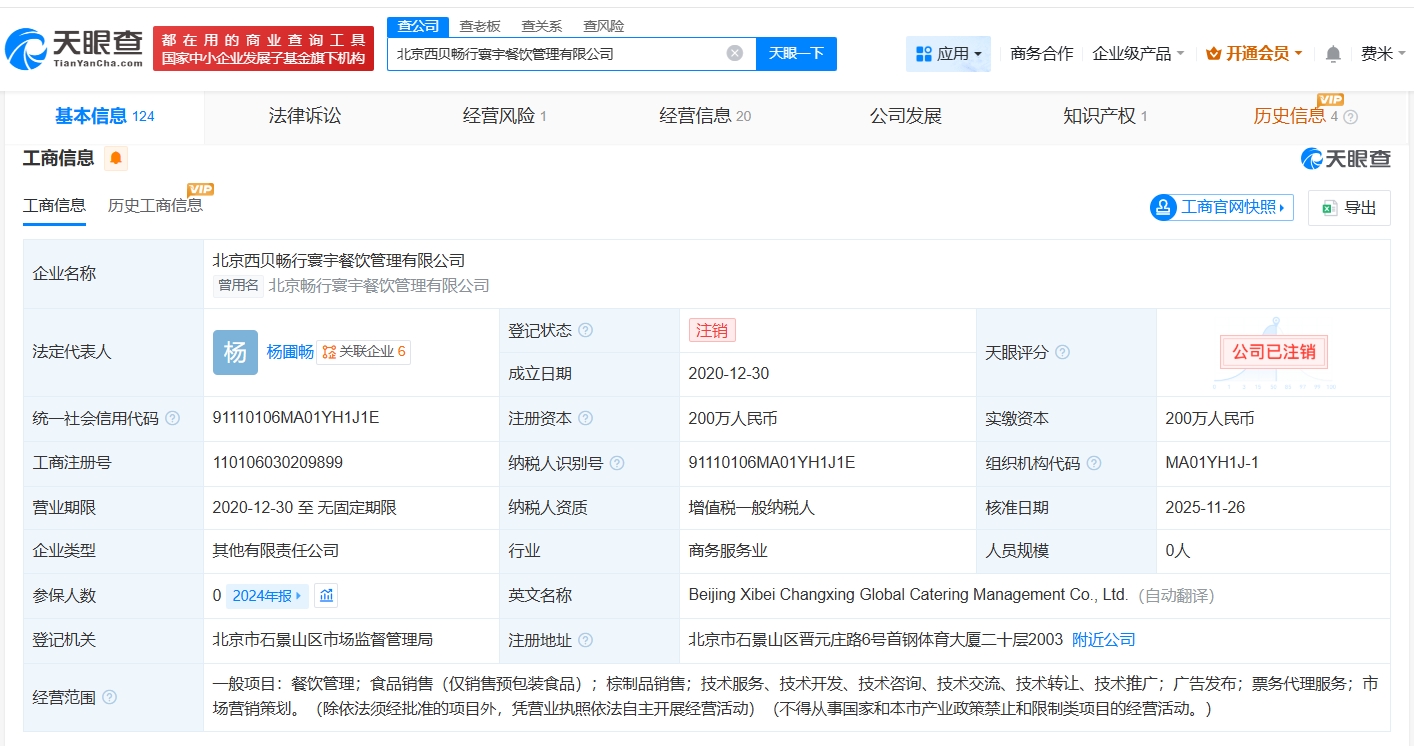 天眼查工商信息显示,近日,北京西贝畅行寰宇餐饮管理有限公司登记状态由存续变更为注销,此前,该公司已发布简易注销公告。