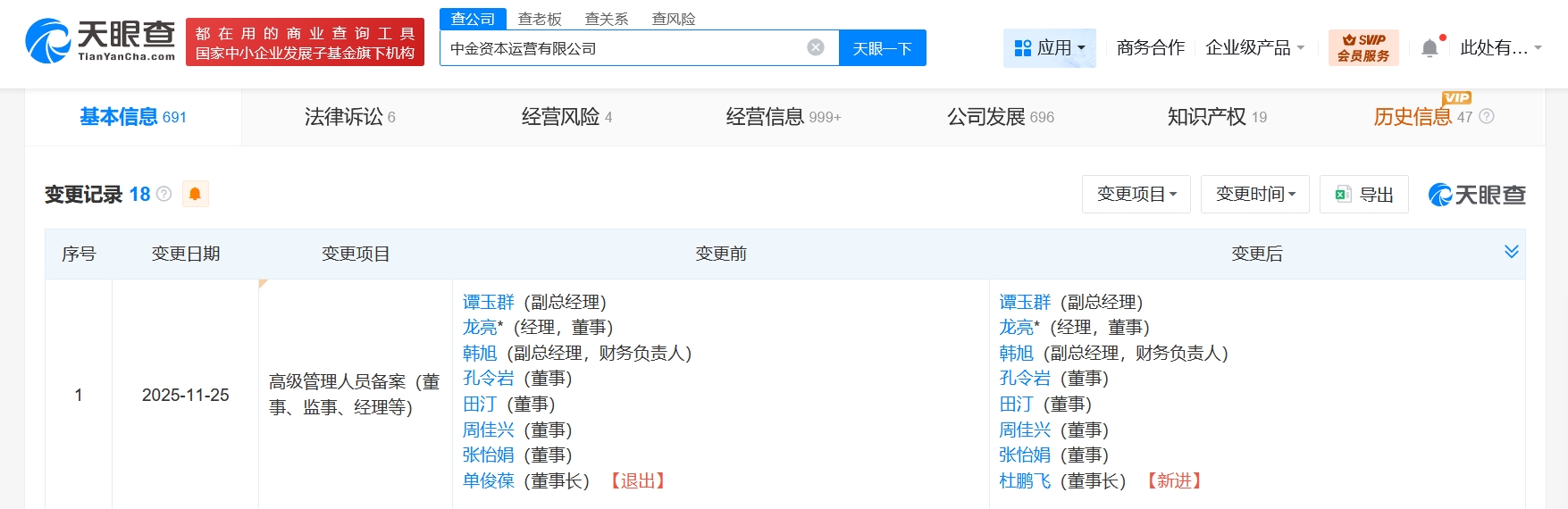 天眼查工商信息显示,近日,中金资本运营有限公司发生工商变更,单俊葆卸任董事长,由杜鹏飞接任。
