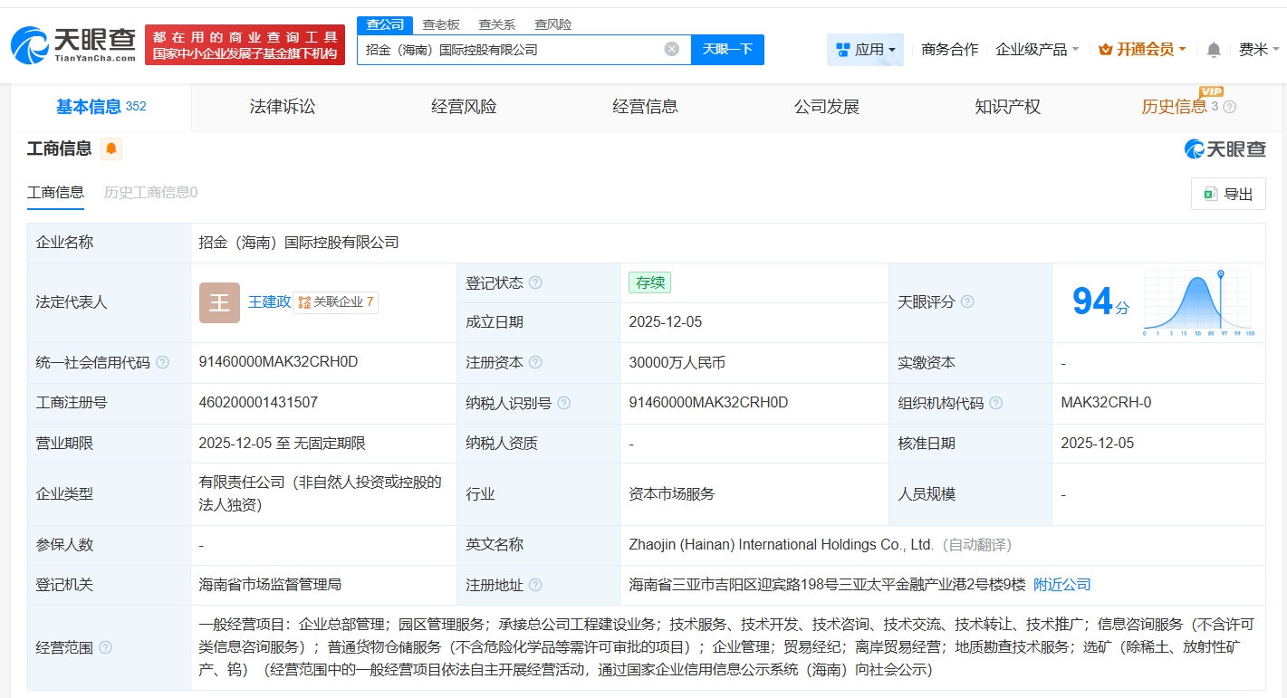 天眼查App显示,近日,招金(海南)国际控股有限公司成立,法定代表人为王建政,注册资本3亿人民币,经营范围包括企业总部管理、园区管理服务、承接总公司工程建设业务等,由招金矿业(01818.HK)全资持股。