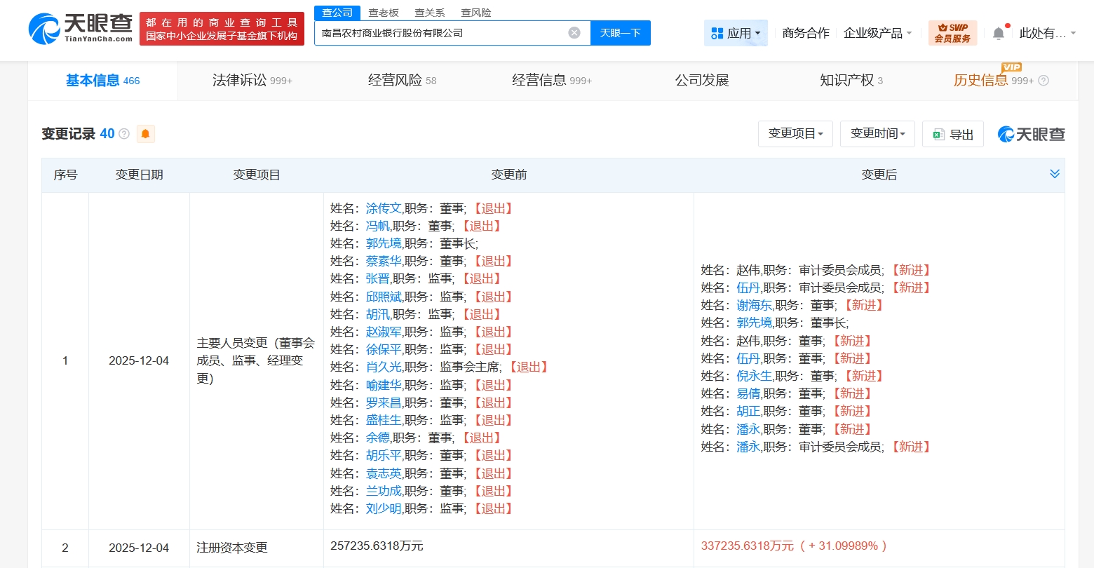 天眼查工商信息显示,近日,南昌农村商业银行股份有限公司发生工商变更,注册资本由约25.7亿人民币增至约33.7亿人民币,增幅约31%,同时,多位高管均发生变更。