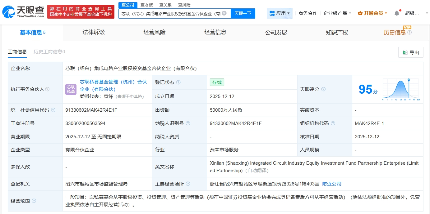 天眼查App显示,近日,芯联(绍兴)集成电路产业股权投资基金合伙企业(有限合伙)成立,执行事务合伙人为芯联私募基金管理(杭州)合伙企业(有限合伙),出资额5亿人民币,经营范围包括以私募基金从事股权投资、投资管理、资产管理等活动。合伙人信息显示,该基金由芯联集成旗下芯联股权投资(杭州)有限公司、绍兴市越城区集成电路产业股权投资基金合伙企业(有限合伙)、绍兴市国鼎多策略股权投资合伙企业(有限合伙)等共同出资。