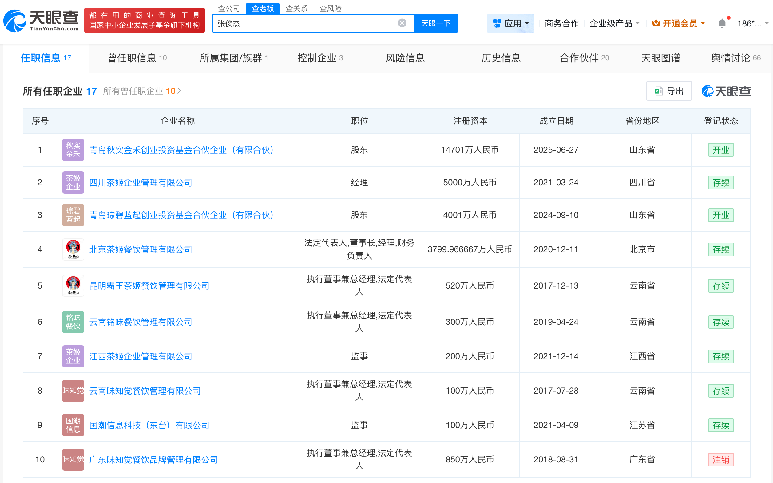 天眼查App显示,张俊杰名下关联十余家企业,其中9家为存续状态,包括北京茶姬餐饮管理有限公司、昆明霸王茶姬餐饮管理有限公司等,涉及投资、企业管理、餐饮等领域,张俊杰在上述企业担任法定代表人、董事长等职务。
