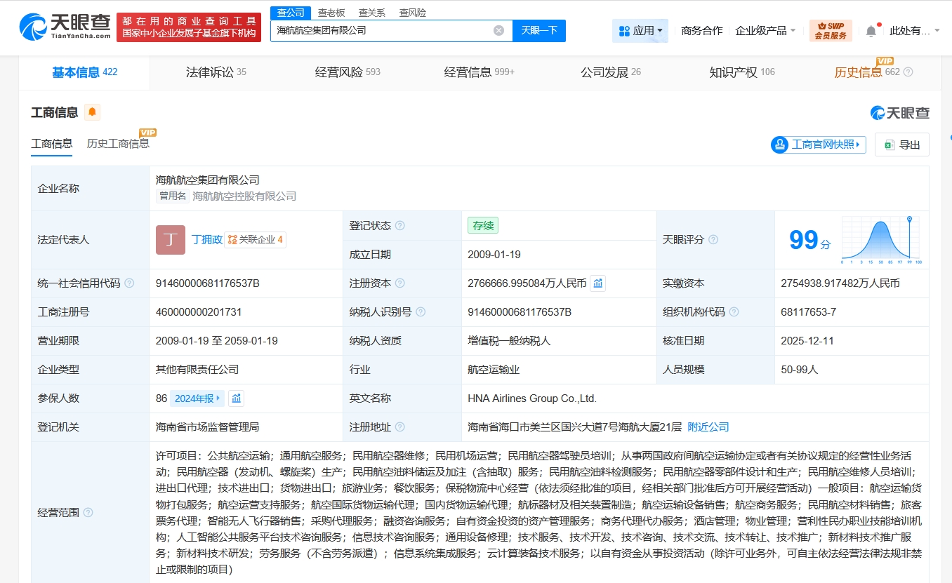 海航航空集团有限公司成立于2009年1月,法定代表人为丁拥政,经营范围含公共航空运输、通用航空服务、民用航空器维修、民用机场运营、民用航空器驾驶员培训、从事两国政府间航空运输协定或者有关协议规定的经营性业务活动、旅游业务、餐饮服务等。股东信息显示,该公司由海南方大航空发展有限公司、海南海航二号信管服务有限公司、海口琼山城市开发建设发展有限公司及上述新增股东共同持股。