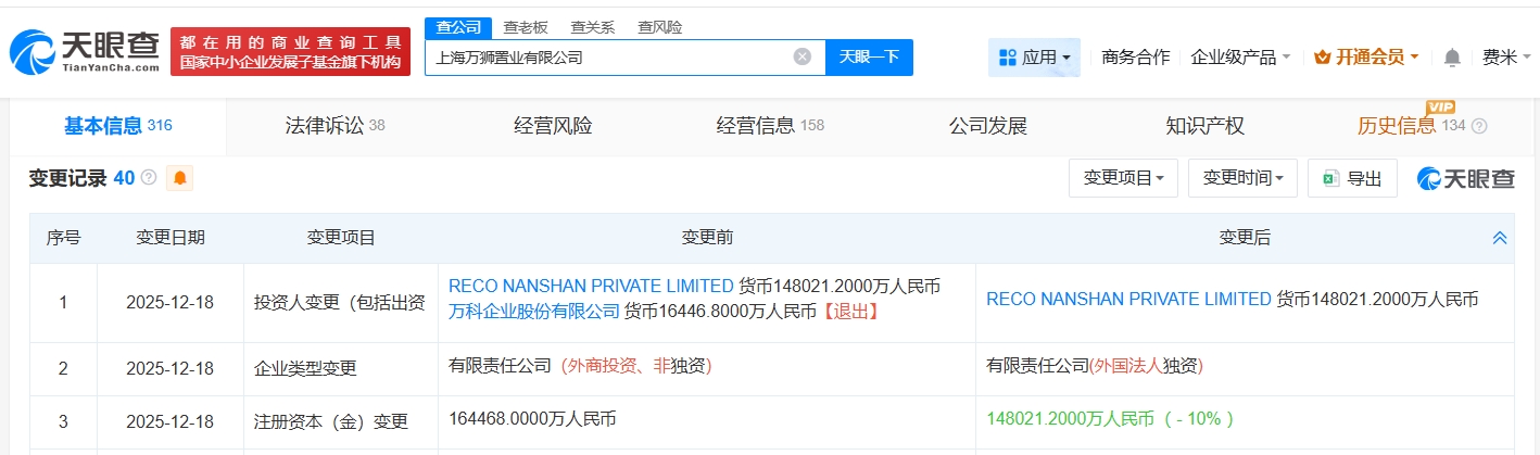 天眼查App显示,近日,上海万狮置业有限公司发生工商变更,原股东万科A(000002)退出,同时,注册资本由约16.4亿人民币减至约14.8亿人民币。