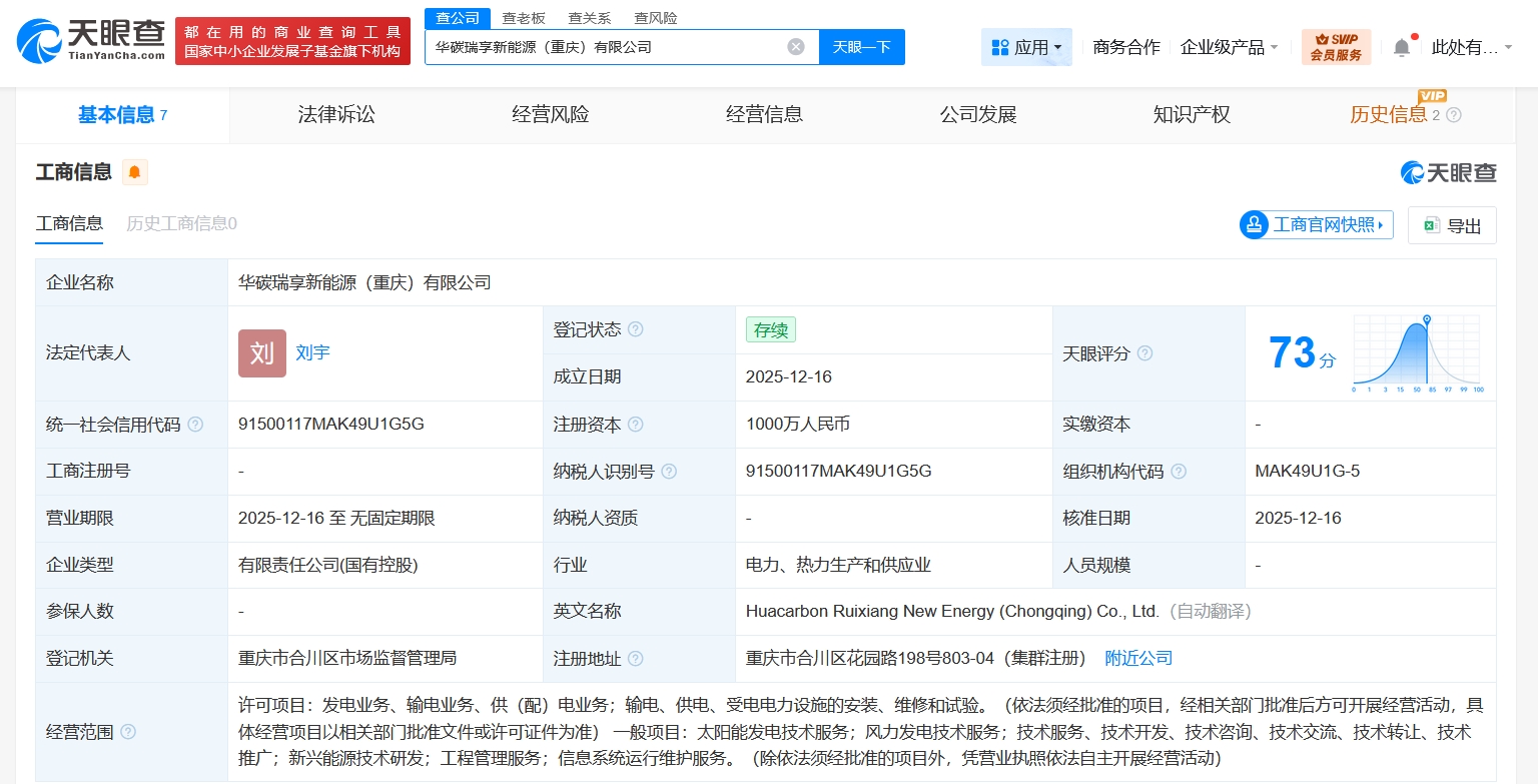 天眼查App显示,近日,华碳瑞享新能源(重庆)有限公司成立,法定代表人为刘宇,注册资本1000万人民币,经营范围含发电业务、输电业务、供(配)电业务,太阳能发电技术服务,风力发电技术服务,新兴能源技术研发,工程管理服务,信息系统运行维护服务等,由华能新能源股份有限公司、浙江碳银碳科技有限公司分别持股80%、20%。