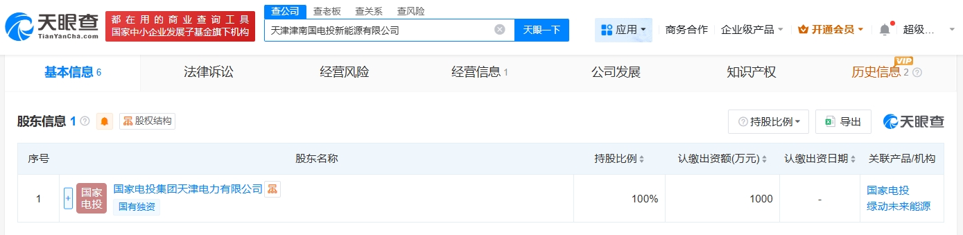 天眼查App显示,近日,天津津南国电投新能源有限公司成立,法定代表人为高孝祺,注册资本1000万人民币,经营范围包括太阳能发电技术服务、新兴能源技术研发、新材料技术推广服务、电力电子元器件销售等。股东信息显示,该公司由国家电投集团天津电力有限公司全资持股。