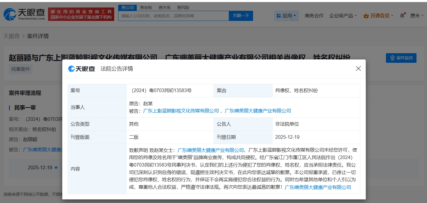 天眼查App显示,12月19日,法院刊登广东上影蓝鲸影视文化传媒有限公司、广东噢美丽大健康产业有限公司向赵丽颖的致歉公告。公告显示,上述两家公司未经赵丽颖许可,使用赵丽颖的肖像及姓名用于“噢美丽”品牌商业宣传,构成共同侵权。法院认定上述行为侵犯了赵丽颖的肖像权、姓名权,应当承担法律责任。上述公司已深刻认识到自身的错误,向赵丽颖表达诚挚的歉意,并郑重承诺已停止一切侵犯赵丽颖肖像权、姓名权的行为,并保证不会再实施侵犯其合法权益的行为。