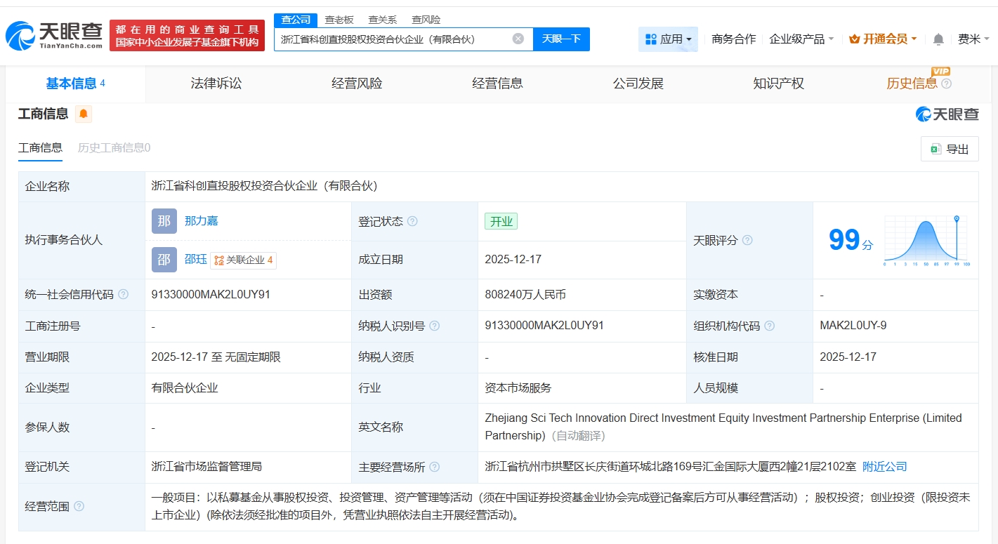 天眼查App显示,近日,浙江省科创直投股权投资合伙企业(有限合伙)成立,执行事务合伙人为那力嘉、邵珏,出资额约80.8亿人民币,经营范围为以私募基金从事股权投资、投资管理、资产管理等活动,股权投资,创业投资,由农银资本管理有限公司、浙江省创新投资私募基金管理有限公司、浙江省社保科创股权投资基金合伙企业(有限合伙)、杭州金创鼎新管理咨询合伙企业(有限合伙)共同出资。
