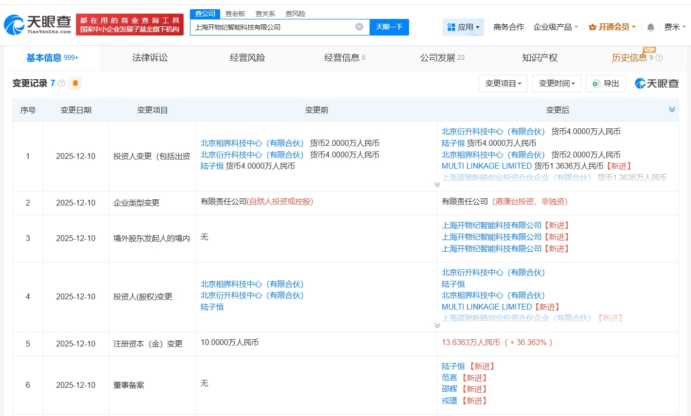天眼查App显示,近日,上海开物纪智能科技有限公司发生工商变更,新增百度旗下三亚百川致新私募股权投资基金合伙企业(有限合伙)、上海蓝驰新皓创业投资合伙企业(有限合伙)等为股东,注册资本由10万人民币增至约13.6万人民币,同时,多位高管发生变更。
