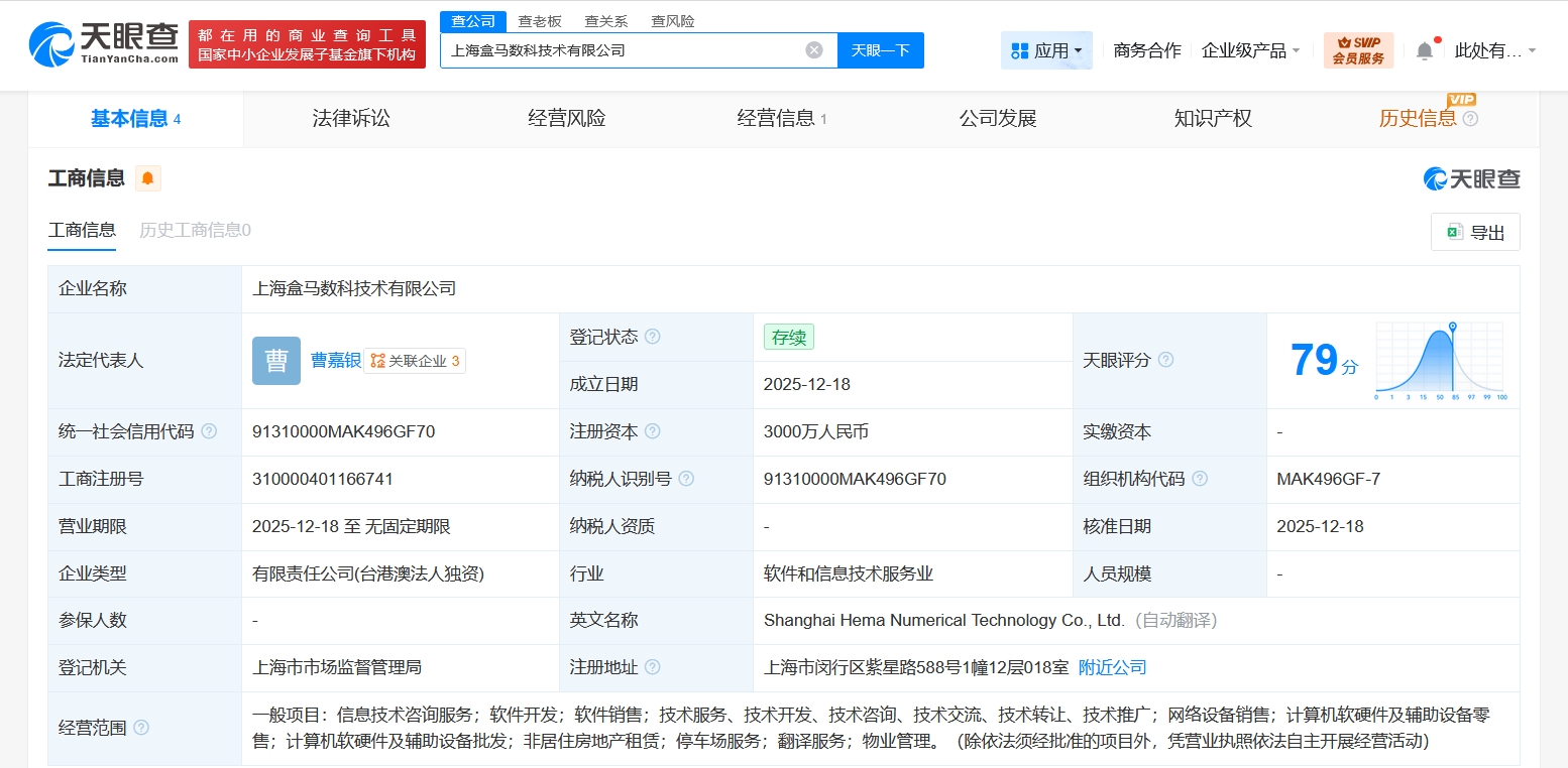 天眼查App显示,近日,上海盒马数科技术有限公司成立,法定代表人为曹嘉银,注册资本3000万人民币,经营范围含信息技术咨询服务、软件开发、软件销售、网络设备销售、计算机软硬件及辅助设备零售、计算机软硬件及辅助设备批发、非居住房地产租赁等,由盒马(中国)有限公司全资持股。