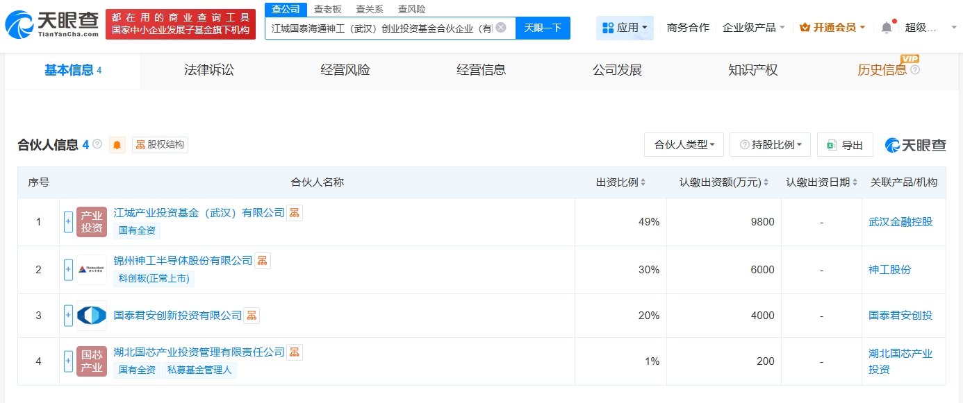 天眼查工商信息显示,近日,江城国泰海通神工(武汉)创业投资基金合伙企业(有限合伙)成立,执行事务合伙人为国泰君安创新投资有限公司,出资额2亿人民币,经营范围为私募股权投资基金管理、创业投资基金管理服务。合伙人信息显示,该基金由江城产业投资基金(武汉)有限公司、神工股份(688233)、国泰海通旗下国泰君安创新投资有限公司等共同出资。