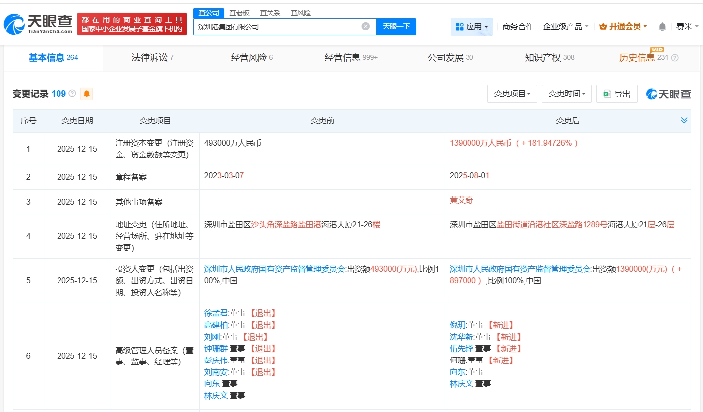 天眼查App显示,近日,深圳港集团有限公司发生工商变更,注册资本由49.3亿人民币增至139亿人民币,增幅约182%,同时,多位高管发生变更。