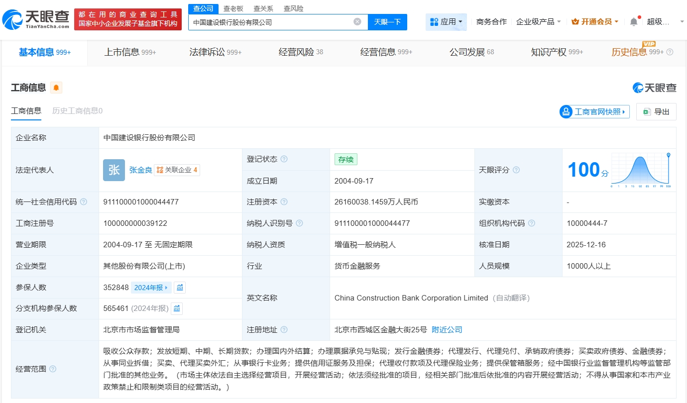 天眼查App显示,近日,建设银行(601939)发生工商变更,注册资本由约2500亿人民币增至约2616亿人民币。