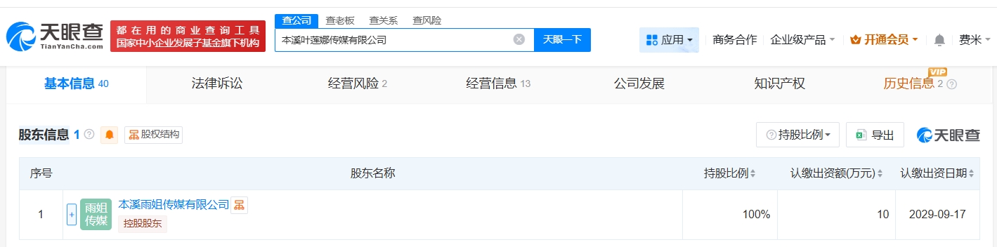 该公司成立于2024年9月,法定代表人为叶莲娜·叶夫格尼耶夫娜·巴热诺娃,实际控制人为东北雨姐丈夫白国辉,注册资本10万人民币,经营范围包括互联网直播技术服务、食品销售、网络设备销售等,由本溪雨姐传媒有限公司全资持股。