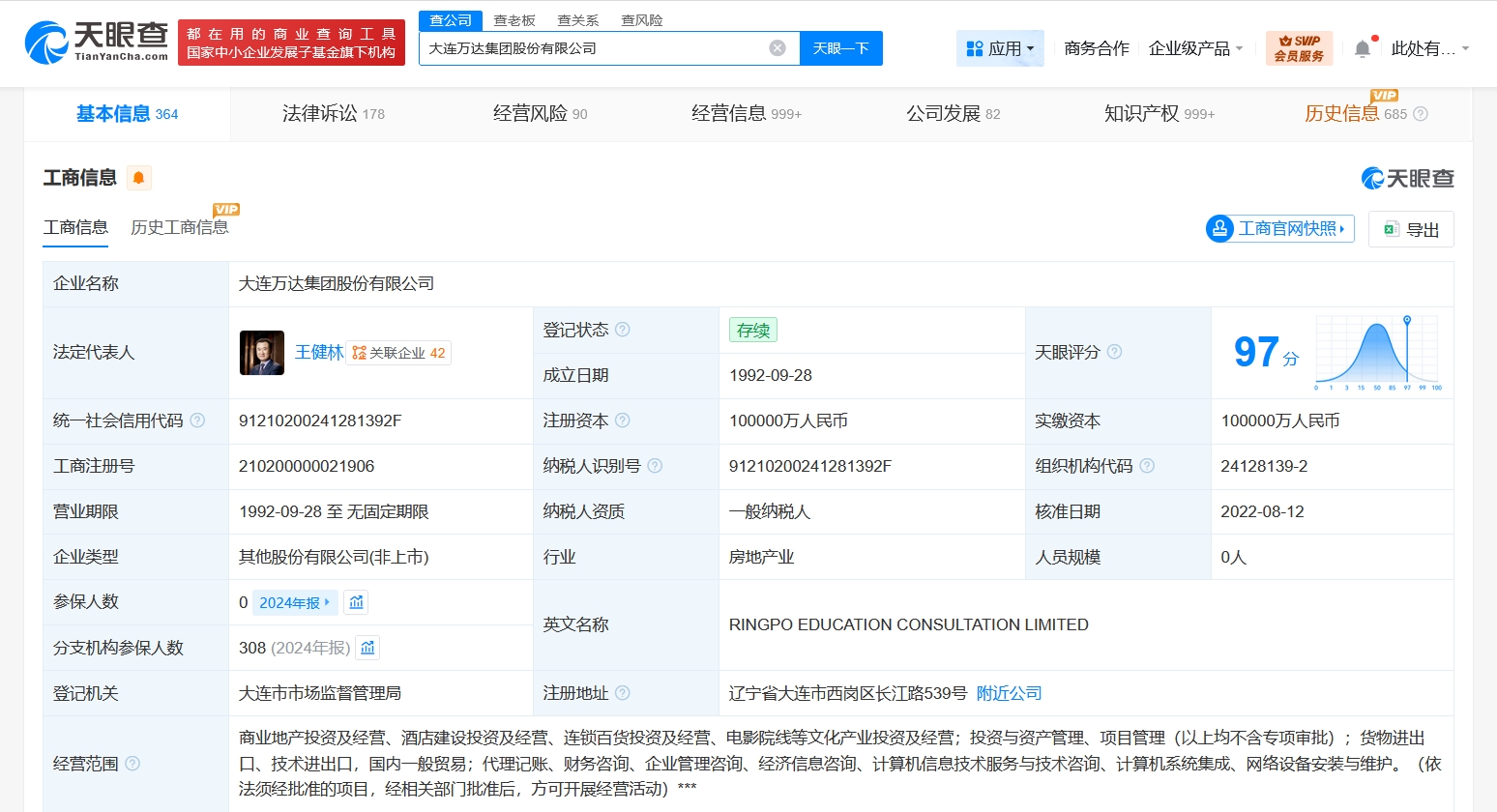 大连万达集团股份有限公司成立于1992年9月,法定代表人为王健林,注册资本10亿人民币,由大连合兴投资有限公司、王健林共同持股。天眼风险信息显示,该公司现存12条被执行人信息,被执行总金额81亿余元,此外,该公司还存在多条股权冻结信息。