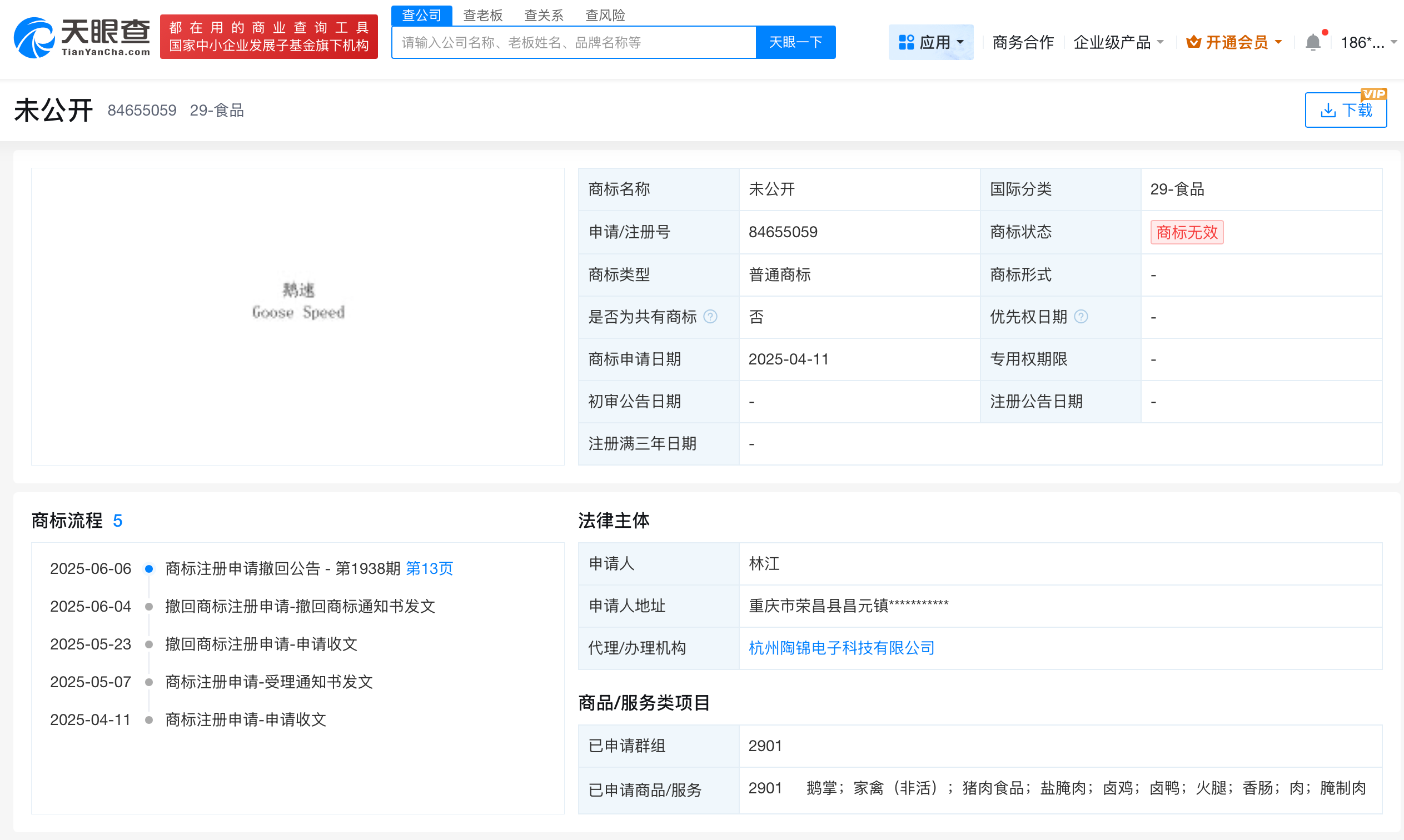此外,卤鹅哥(林江)曾申请注册“鹅速Goose Speed”商标,国际分类为食品,当前商标为无效状态。公开信息显示,甲亢哥又名Speed。