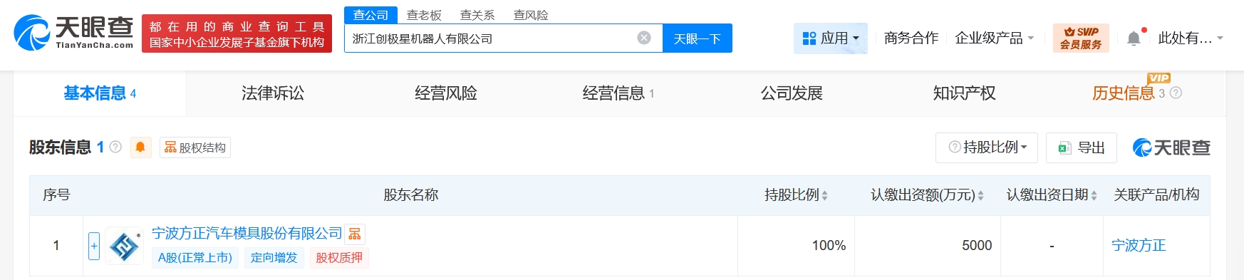 天眼查App显示,近日,浙江创极星机器人有限公司成立,法定代表人为方永杰,注册资本5000万人民币,经营范围含工程和技术研究和试验发展、工业机器人销售、特殊作业机器人制造、服务消费机器人制造、工业机器人制造、电机及其控制系统研发、机械设备研发、通用设备制造等,由宁波方正(300998)全资持股。