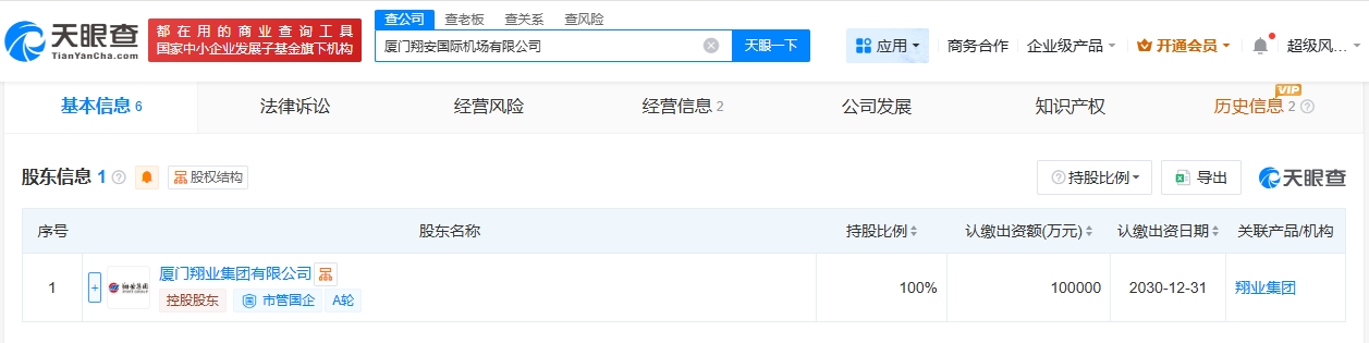 天眼查App显示,近日,厦门翔安国际机场有限公司成立,法定代表人为张仕亮,注册资本10亿人民币,经营范围包括民用机场运营、旅客票务代理、航空运输货物打包服务、装卸搬运、国内货物运输代理等。股东信息显示,该公司由厦门翔业集团有限公司全资持股。