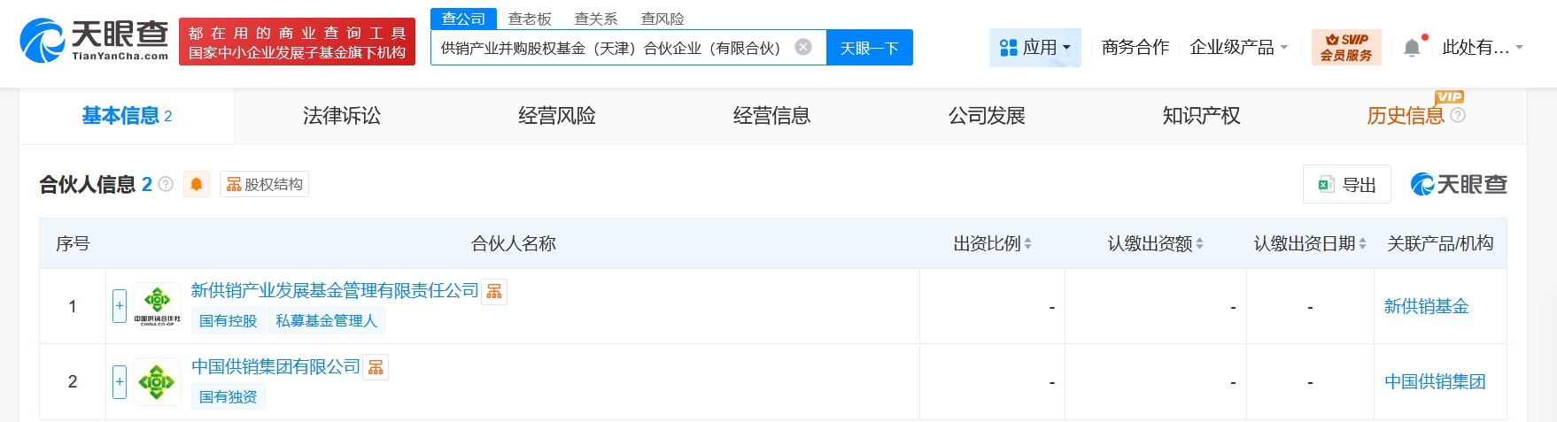 天眼查App显示,近日,供销产业并购股权基金(天津)合伙企业(有限合伙)成立,执行事物合伙人为新供销产业发展基金管理有限责任公司,出资额2.8亿人民币,经营范围为以私募基金从事股权投资、投资管理、资产管理等活动。合伙人信息显示,该基金由中国供销集团有限公司及旗下新供销产业发展基金管理有限责任公司共同出资。