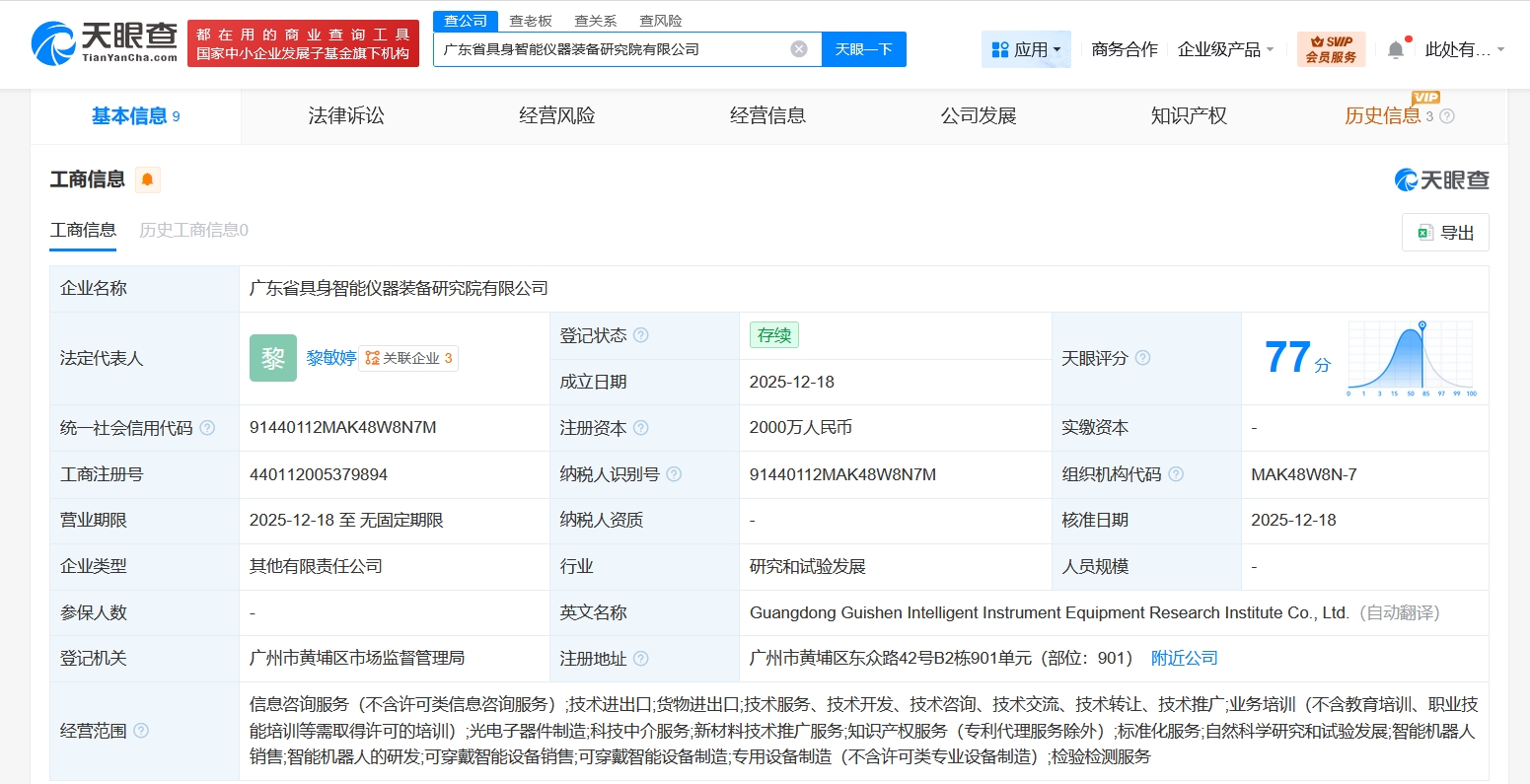 天眼查App显示,近日,广东省具身智能仪器装备研究院有限公司成立,法定代表人为黎敏婷,注册资本2000万人民币,经营范围含信息咨询服务、技术进出口、货物进出口、光电子器件制造、科技中介服务、新材料技术推广服务、知识产权服务、自然科学研究和试验发展、智能机器人销售、智能机器人的研发、可穿戴智能设备销售等,由广东省科学院认证有限公司、广州众纳科技有限公司共同持股。