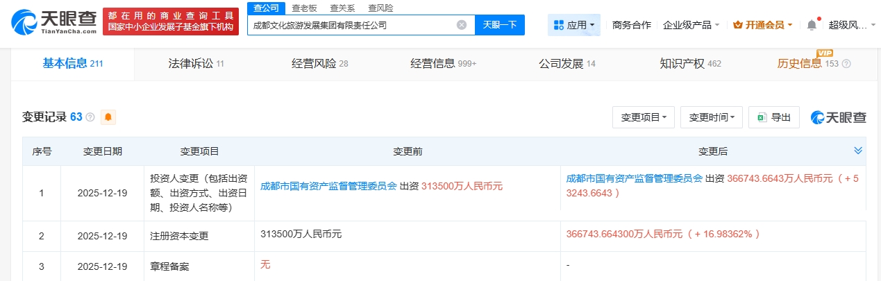 天眼查工商信息显示,近日,成都文化旅游发展集团有限责任公司发生工商变更,注册资本由31.35亿人民币增至约36.67亿人民币,增幅约17%。