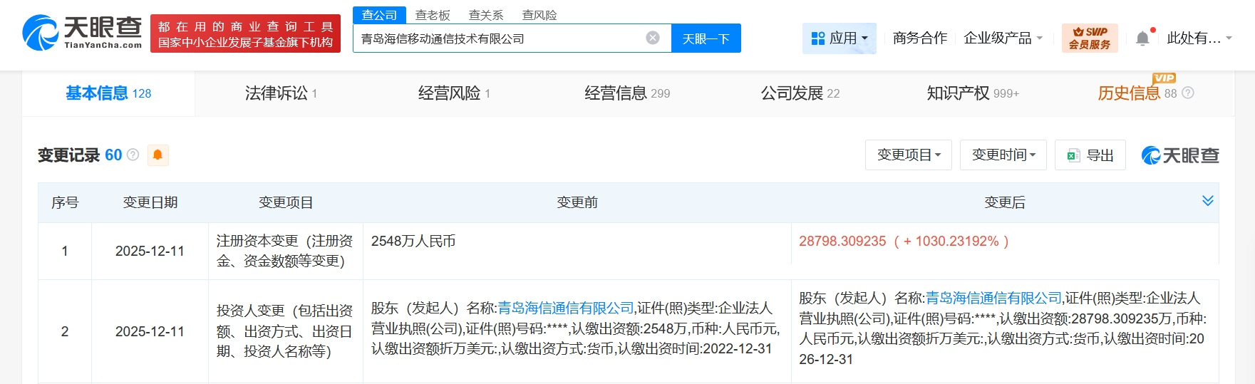 天眼查App显示,近日,青岛海信移动通信技术有限公司发生工商变更,注册资本由2548万人民币增至约2.9亿人民币,增幅约1030%。