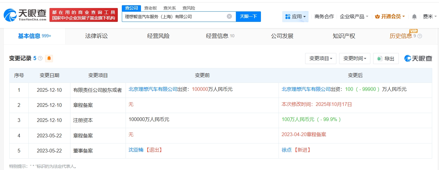 天眼查App显示,近日,理想智造汽车服务(上海)有限公司发生工商变更,注册资本由10亿人民币减至100万人民币,降幅99.9%,