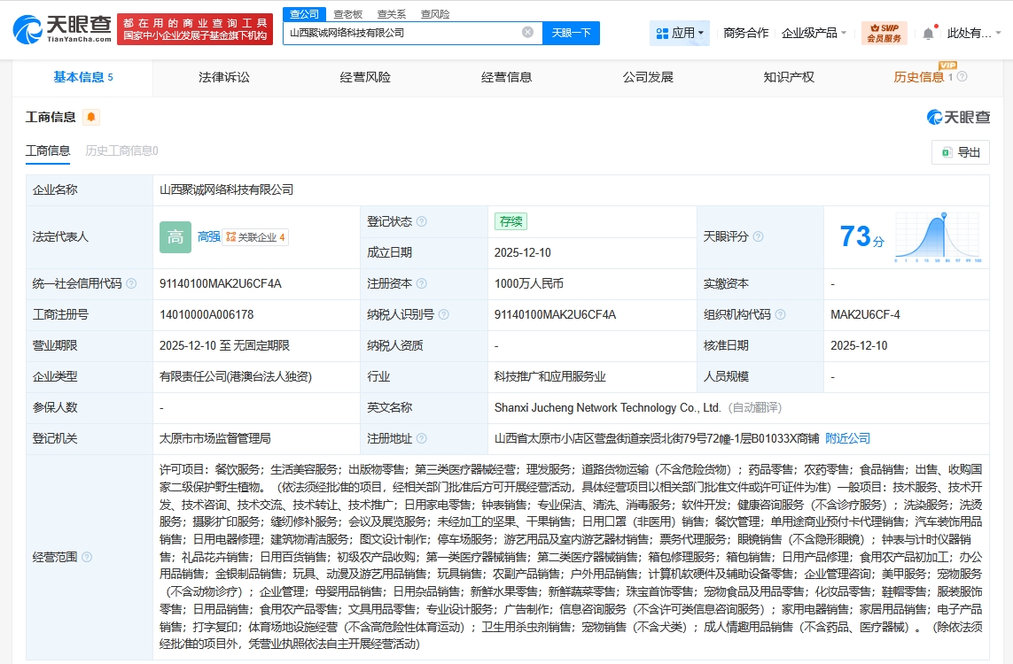 天眼查App显示,近日,山西聚诚网络科技有限公司成立,法定代表人为高强,注册资本1000万人民币,经营范围含餐饮服务、食品销售、日用家电零售、健康咨询服务、会议及展览服务、单用途商业预付卡代理销售、停车场服务、日用百货销售等,由盒马(中国)有限公司全资持股。
