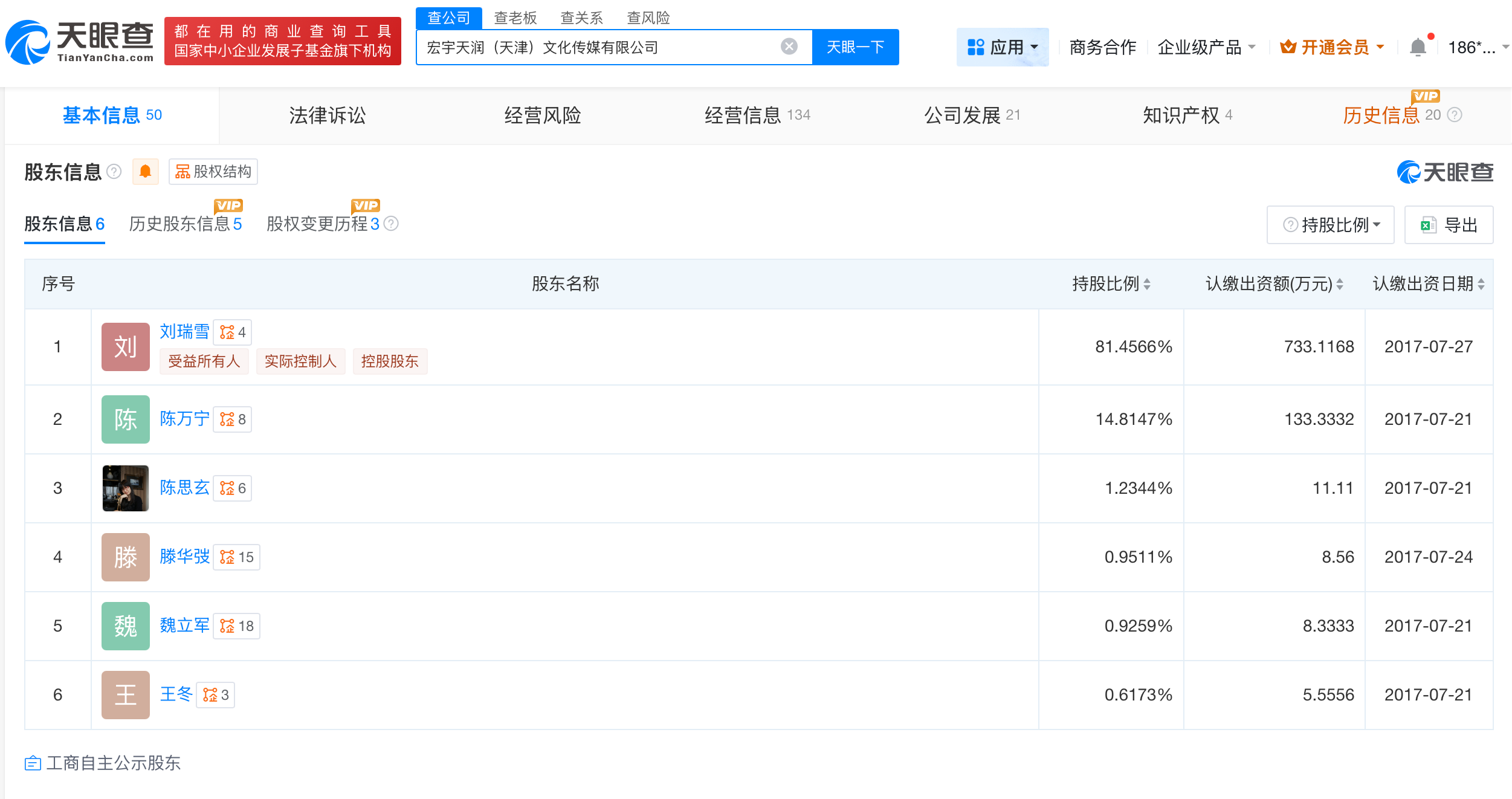 宏宇天润(天津)文化传媒有限公司成立于2014年12月,法定代表人为刘瑞雪,注册资本约900万人民币,经营范围包括版权服务代理、媒体宣传推广、作家经纪等。股东信息显示,该公司由刘瑞雪、陈万宁、陈思玄等共同持股。变更记录显示,今年2月,该公司注册资本由约1111万人民币减至约900万人民币。