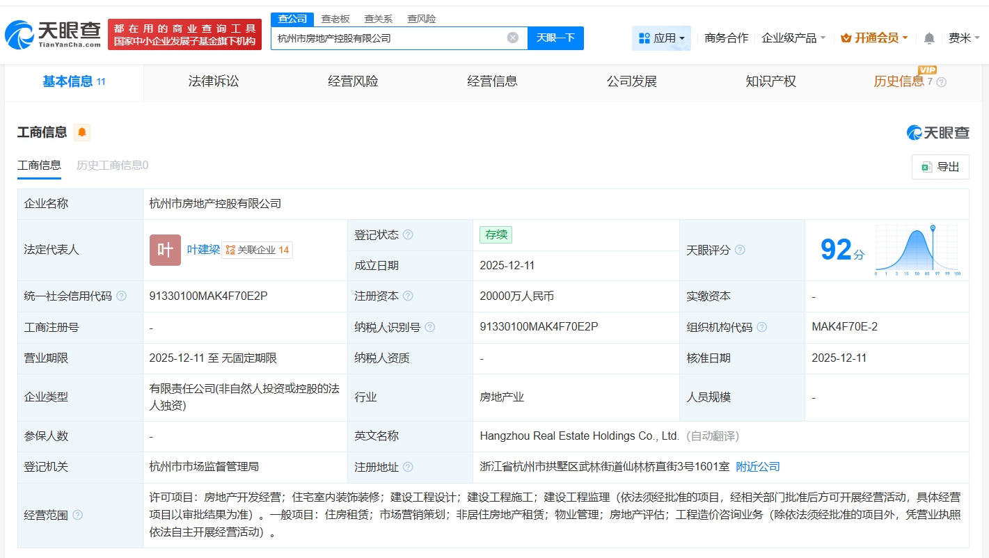 天眼查App显示,近日,杭州市房地产控股有限公司成立,法定代表人为叶建梁,注册资本2亿人民币,经营范围包括房地产开发经营、住宅室内装饰装修、建设工程设计等,由杭州市城市建设投资集团有限公司全资持股。
