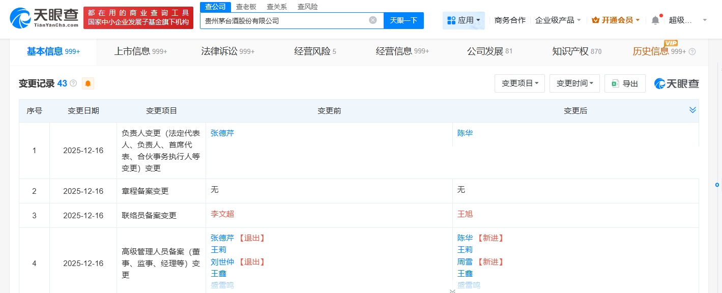 天眼查App显示,近日,贵州茅台(600519)发生工商变更,张德芹卸任法定代表人、董事长,由陈华接任,同时部分主要人员也发生变更。
