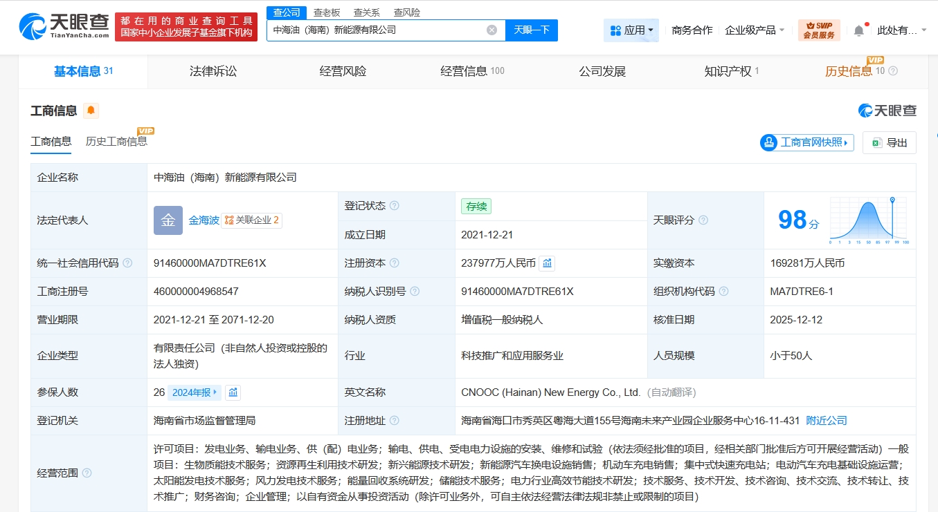 天眼查App显示,近日,中海油(海南)新能源有限公司发生工商变更,注册资本由约18.3亿人民币增至约23.8亿人民币,增幅约30%,同时,部分主要人员也发生变更。