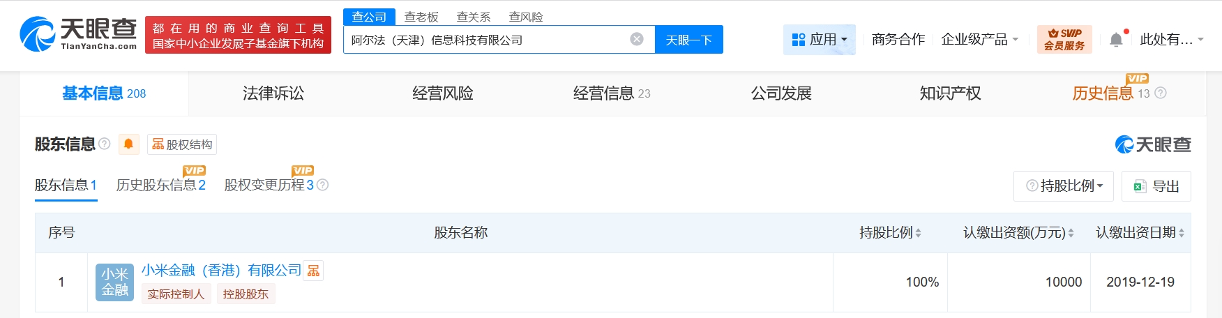 该公司成立于2019年6月,法定代表人为岳凯,注册资本1亿人民币,由小米金融(香港)有限公司全资持股。