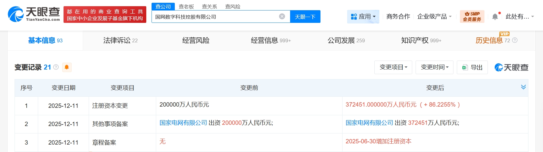 天眼查App显示,近日,国网数字科技控股有限公司发生工商变更,注册资本由20亿人民币增至约37.2亿人民币,增幅约86%。
