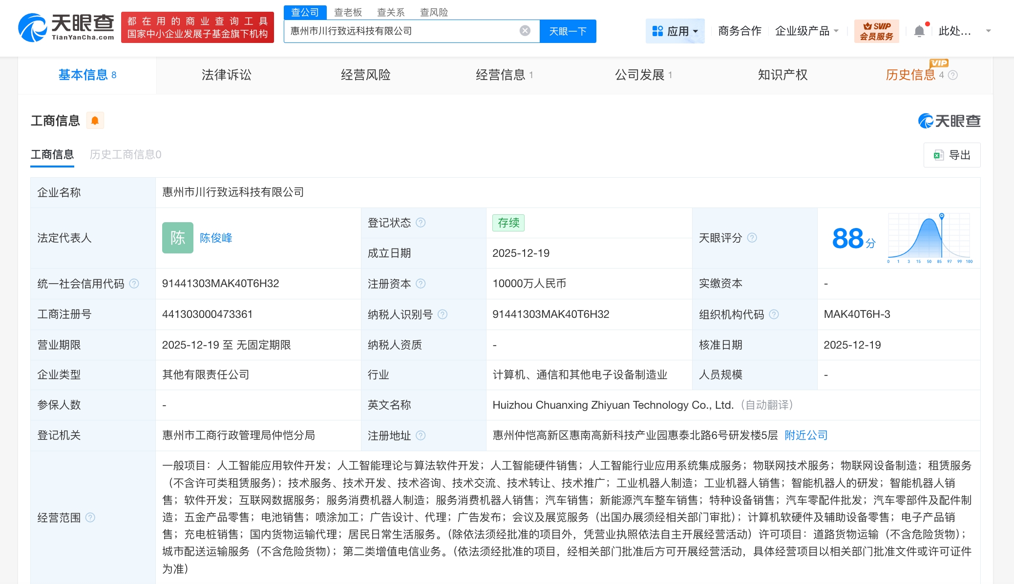 天眼查App显示,近日,惠州市川行致远科技有限公司成立,法定代表人为陈俊峰,注册资本1亿人民币,经营范围含人工智能应用软件开发、人工智能理论与算法软件开发、人工智能硬件销售、人工智能行业应用系统集成服务、物联网技术服务、物联网设备制造、工业机器人制造、工业机器人销售、智能机器人的研发、新能源汽车整车销售等,由德赛西威(002920)、惠州市川致昌投资咨询合伙企业(有限合伙)、惠州市川致德投资咨询合伙企业(有限合伙)、惠州市川致杰投资咨询合伙企业(有限合伙)共同持股。
