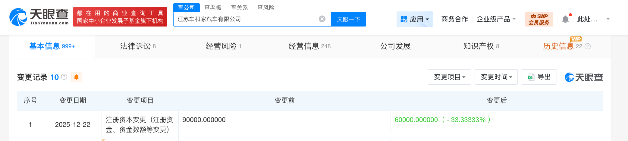 天眼查App显示,近日,江苏车和家汽车有限公司发生工商变更,注册资本由9亿人民币减至6亿人民币,降幅约33%。