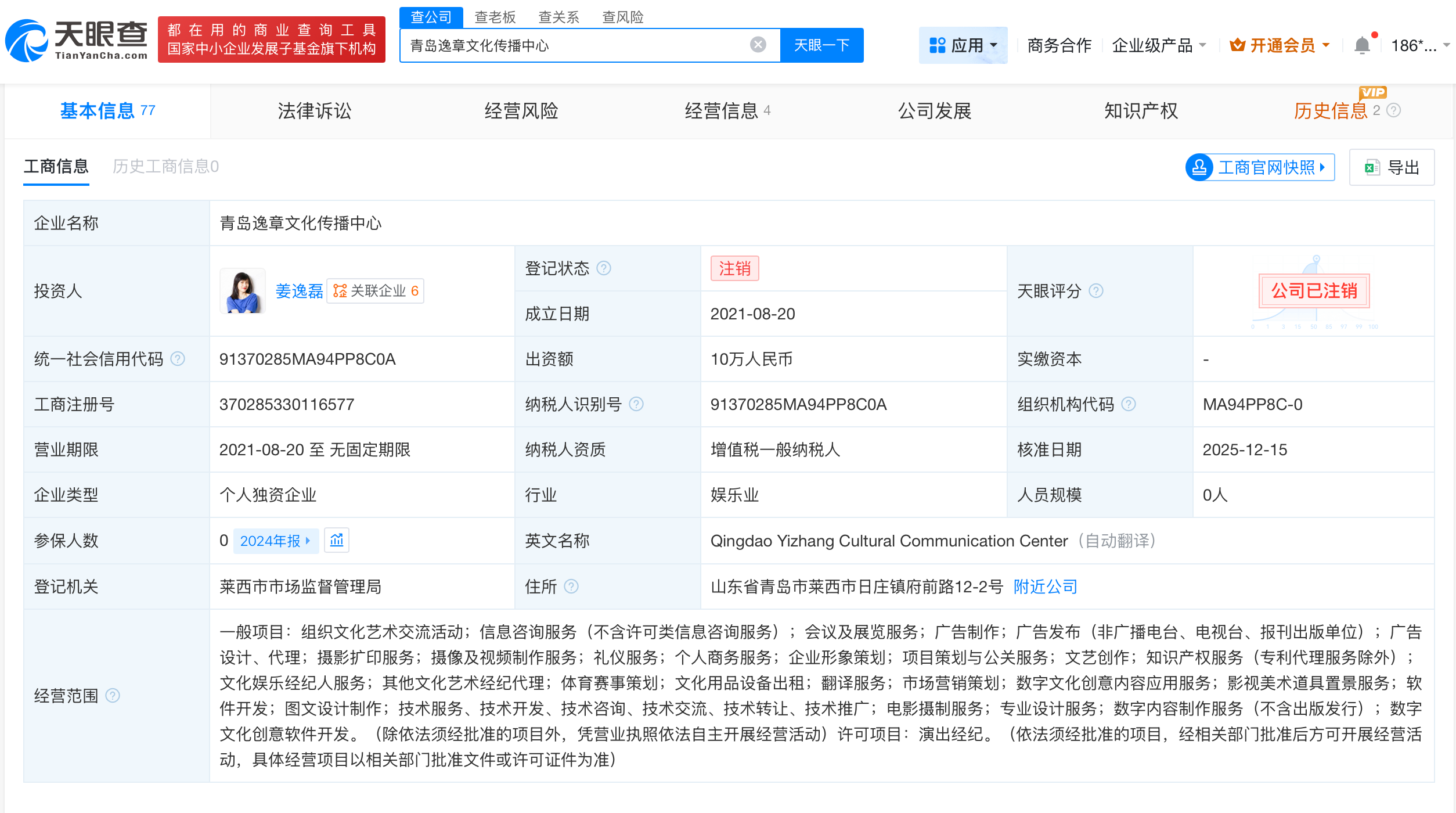 青岛逸章文化传播中心成立于2021年8月,投资人为姜逸磊(papi酱),出资额10万人民币,经营范围包括组织文化艺术交流活动、信息咨询服务等,为姜逸磊(papi酱)个人独资企业。目前,姜逸磊(papi酱)名下公司均已注销。