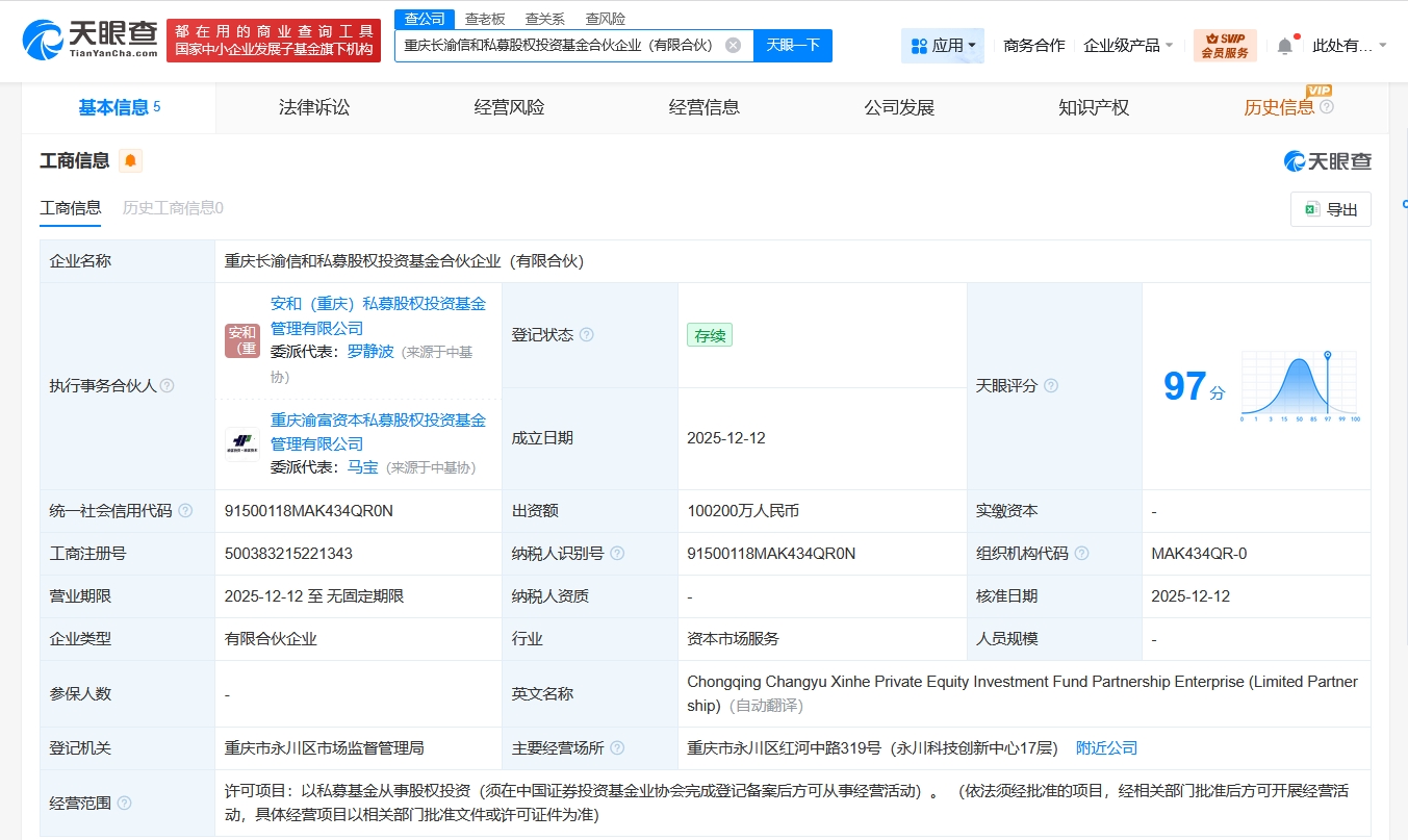 天眼查App显示,近日,重庆长渝信和私募股权投资基金合伙企业(有限合伙)成立,执行事务合伙人为安和(重庆)私募股权投资基金管理有限公司、重庆渝富资本私募股权投资基金管理有限公司,出资额10.02亿人民币,经营范围为以私募基金从事股权投资。合伙人信息显示,该基金由重庆战略性新兴产业股权投资基金合伙企业(有限合伙)、建信信托有限责任公司、长安汽车(000625)等共同出资。
