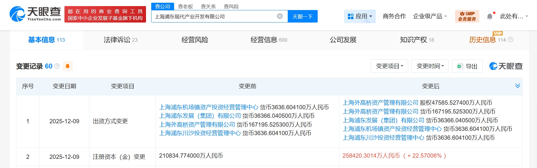 天眼查App显示,近日,上海浦东现代产业开发有限公司发生工商变更,注册资本由约21.1亿人民币增至约25.8亿人民币,增幅约23%。
