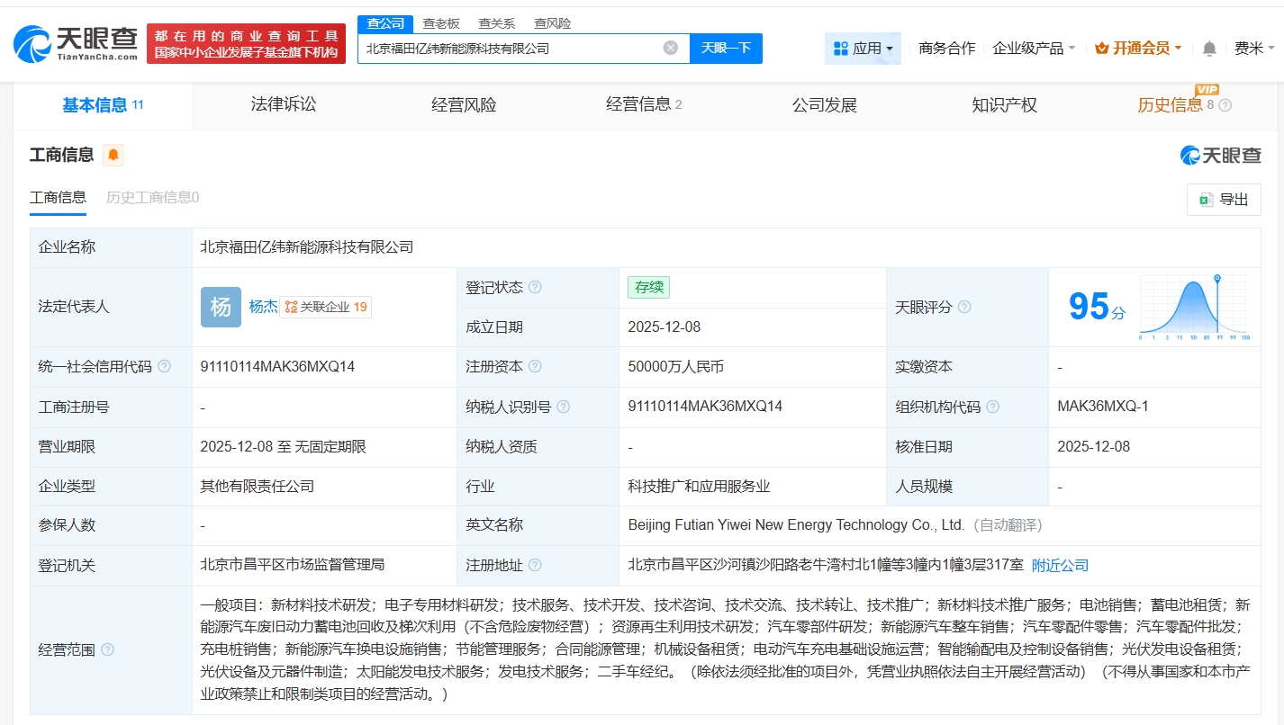 天眼查App显示,近日,北京福田亿纬新能源科技有限公司成立,法定代表人为杨杰,注册资本5亿人民币,经营范围包括新材料技术研发、电子专用材料研发、电池销售等,由亿纬锂能(300014)、福田汽车(600166)共同持股。