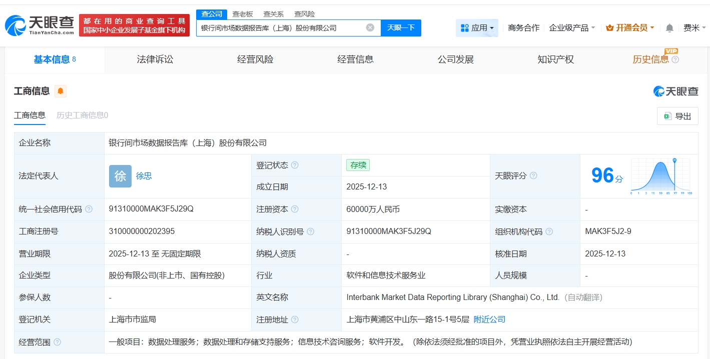 天眼查App显示,近日,银行间市场数据报告库(上海)股份有限公司成立,法定代表人为徐忠,注册资本6亿人民币,经营范围为数据处理服务、数据处理和存储支持服务、信息技术咨询服务、软件开发,由上海票据交易所股份有限公司、中国银行间市场交易商协会、中汇信息技术(上海)有限公司、中债资信评估有限责任公司等共同持股。