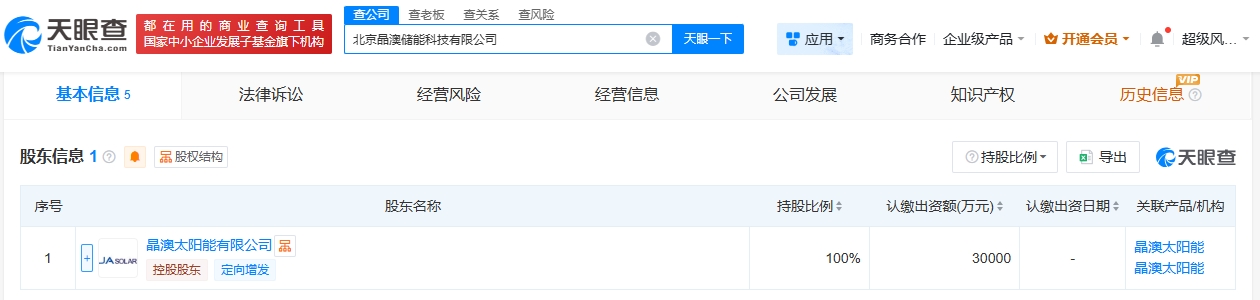 天眼查工商信息显示,近日,北京晶澳储能科技有限公司成立,法定代表人为金斌,注册资本3亿人民币,经营范围包括新兴能源技术研发、储能技术服务、新能源原动设备制造、新能源原动设备销售等。股东信息显示,该公司由晶澳科技(002459)旗下晶澳太阳能有限公司全资持股。