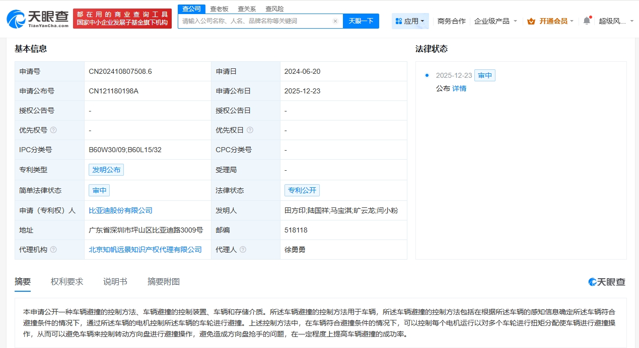 天眼查App显示,近日,比亚迪股份有限公司申请的“车辆避撞的控制方法和控制装置、车辆及存储介质”专利公布。