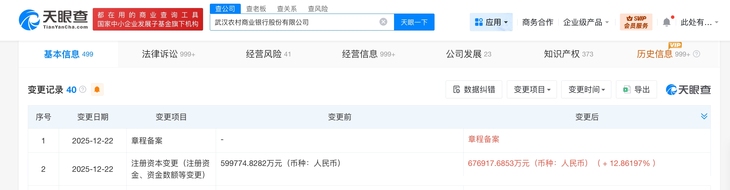 天眼查App显示,近日,武汉农村商业银行股份有限公司发生工商变更,注册资本由约59.98亿人民币增至约67.7亿人民币,增幅约13%。