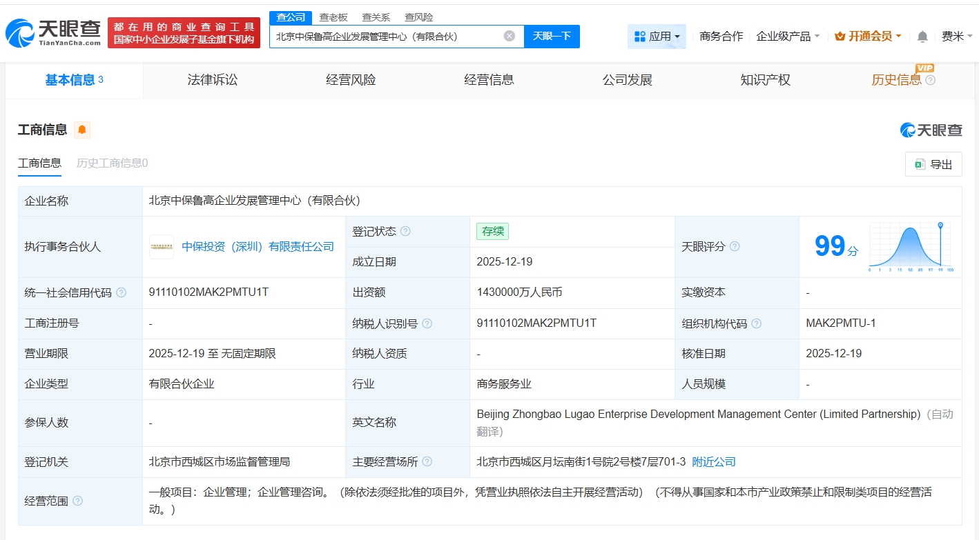 天眼查App显示,近日,北京中保鲁高企业发展管理中心(有限合伙)成立,执行事务合伙人为中保投资(深圳)有限责任公司,出资额143亿人民币,经营范围为企业管理、企业管理咨询,由中国保险投资基金(有限合伙)、山东省农村经济开发投资有限公司、中保投资(深圳)有限责任公司共同出资。