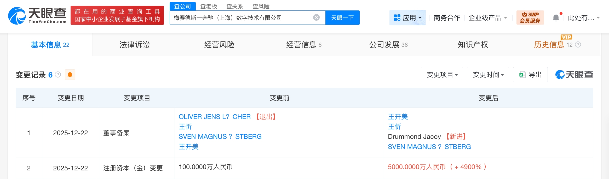 天眼查工商信息显示,近日,梅赛德斯一奔驰(上海)数字技术有限公司发生工商变更,注册资本由100万人民币增至5000万人民币,增幅4900%,同时,部分高管也发生变更。