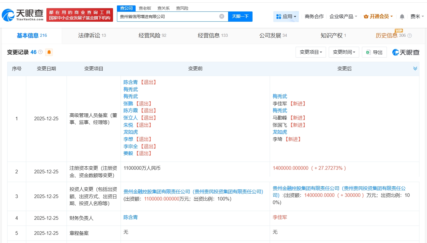 天眼查App显示,近日,贵州省信用增进有限公司发生工商变更,注册资本由110亿人民币增至140亿人民币,增幅约27%,同时,多位高管发生变更。