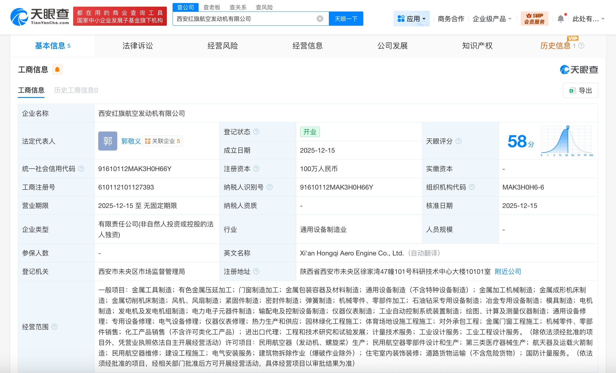 天眼查App显示,近日,西安红旗航空发动机有限公司成立,法定代表人为郭敬义,注册资本100万人民币,经营范围含金属工具制造、有色金属压延加工、门窗制造加工、金属包装容器及材料制造、通用设备制造、金属加工机械制造、冶金专用设备制造、仪器仪表修理、热力生产和供应等,由航发动力(600893)全资持股。