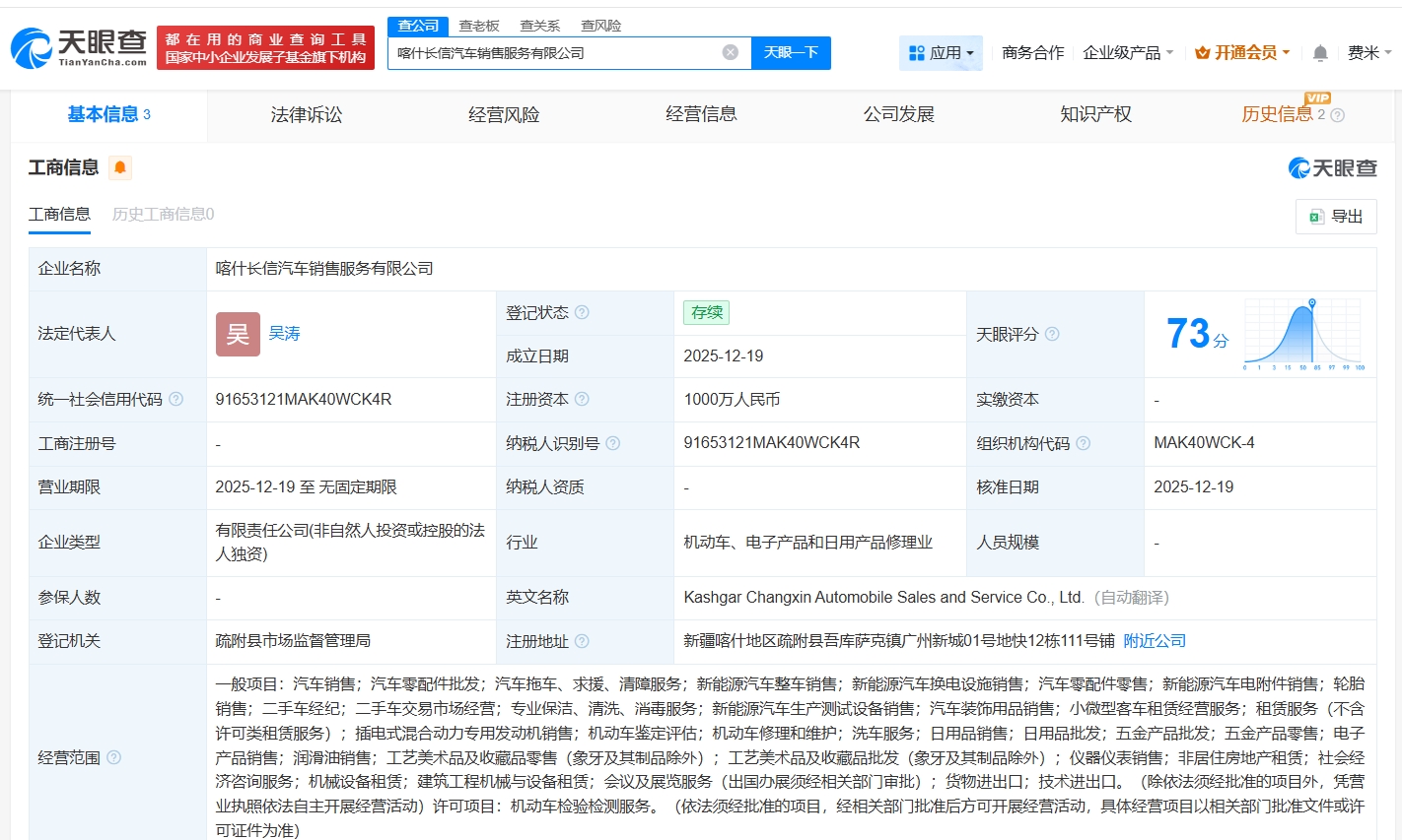 天眼查App显示,近日,喀什长信汽车销售服务有限公司成立,法定代表人为吴涛,注册资本1000万人民币,经营范围包括汽车销售、汽车零配件批发、新能源汽车整车销售等,由广汽集团(601238)旗下广汽商贸有限公司全资持股。